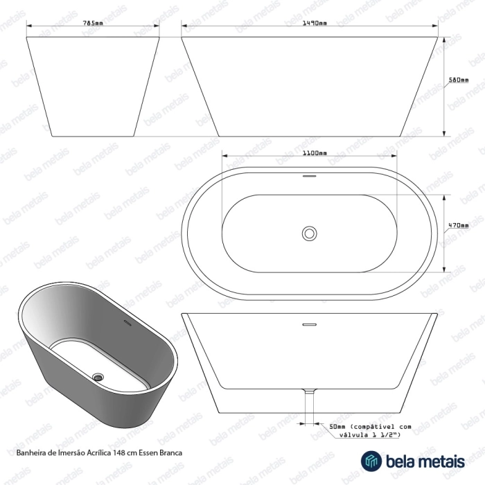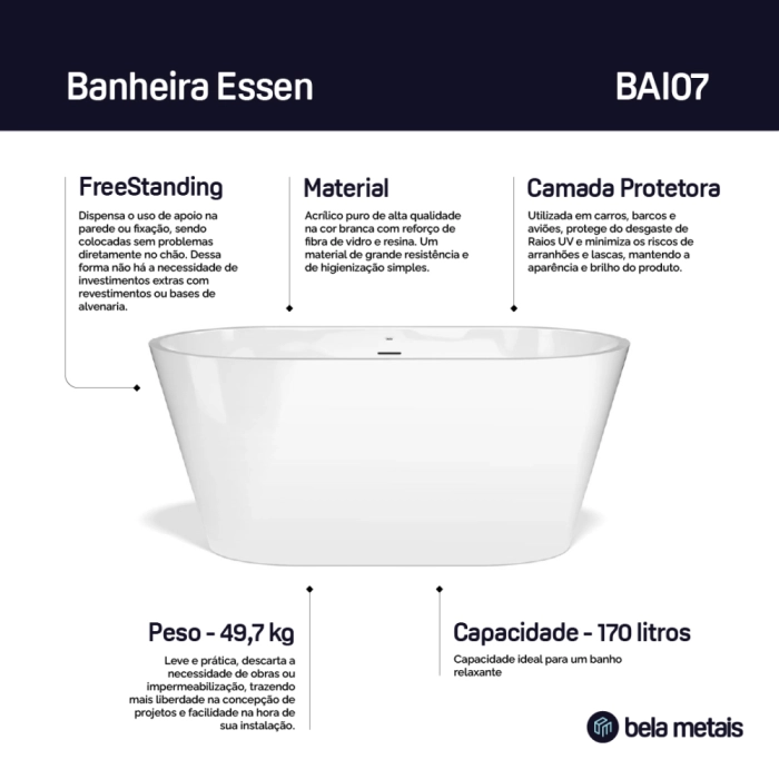 Banheira de Imersão Acrílica 148 cm (Essen Branca)