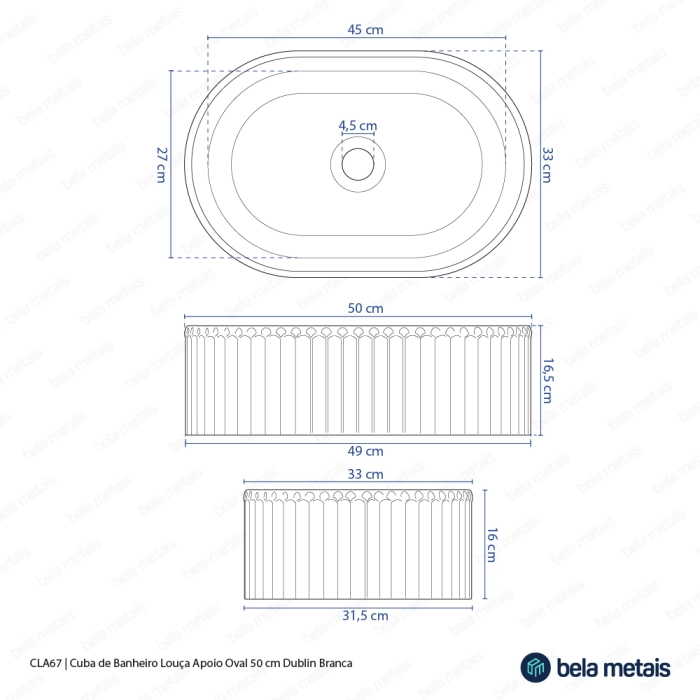 Cuba de Banheiro Louça Apoio Oval 50 cm (Dublin Branca)