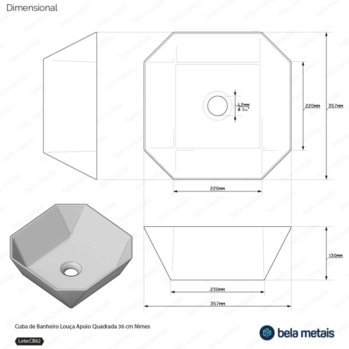 Cuba de Banheiro Louça Apoio Quadrada 36 cm (Nimes Cinza)