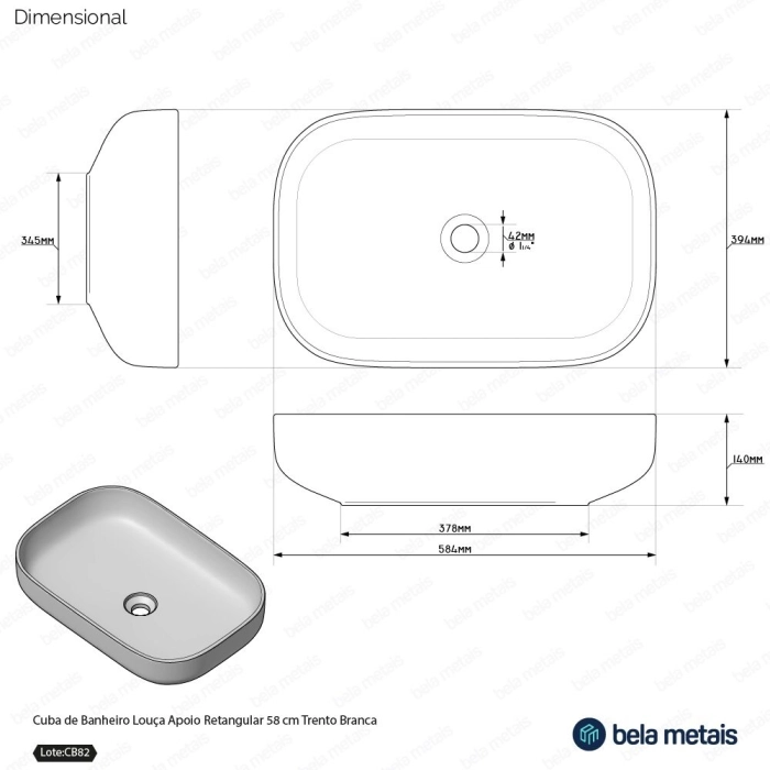 Cuba de Banheiro Louça Apoio Retangular 58 cm (Trento Branca)