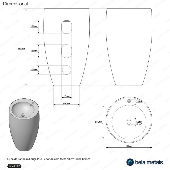 Cuba de Banheiro Louça Piso Redonda com Mesa 50 cm (Siena Branca)