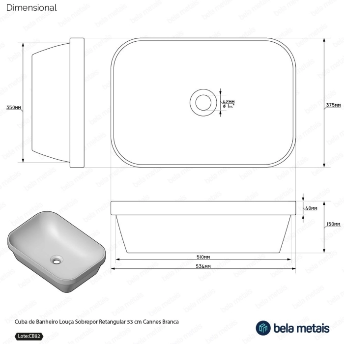 Cuba de Banheiro Louça Sobrepor Retangular 53 cm (Cannes Branca)