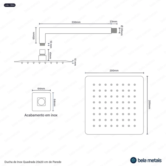 Ducha de Inox Quadrada 20x20 cm de Parede (Dourada)