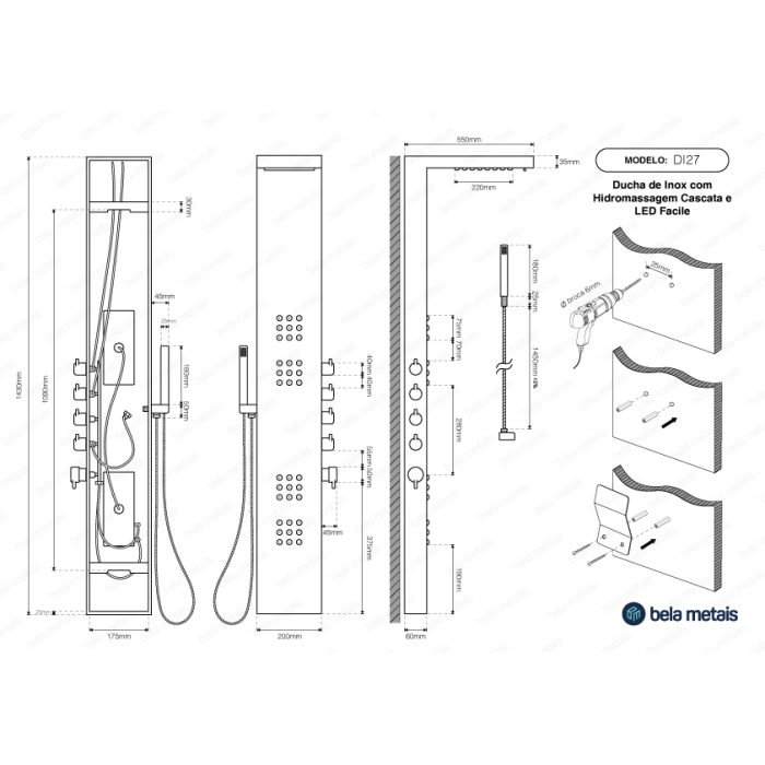 Ducha Vertical com Hidro Cascata e Led Square (Inox Preta Fosca) - Outlet