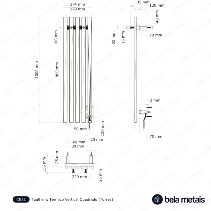 Toalheiro Térmico Vertical Quadrado (Torres Cromado)
