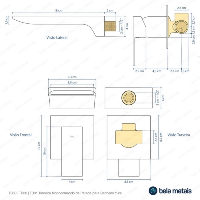 Torneira Monocomando de Parede para Banheiro (Yura Preta Fosca)