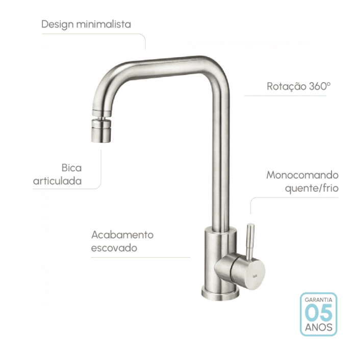 Torneira Monocomando Giratória de Cozinha Inox (Malta Escovada)