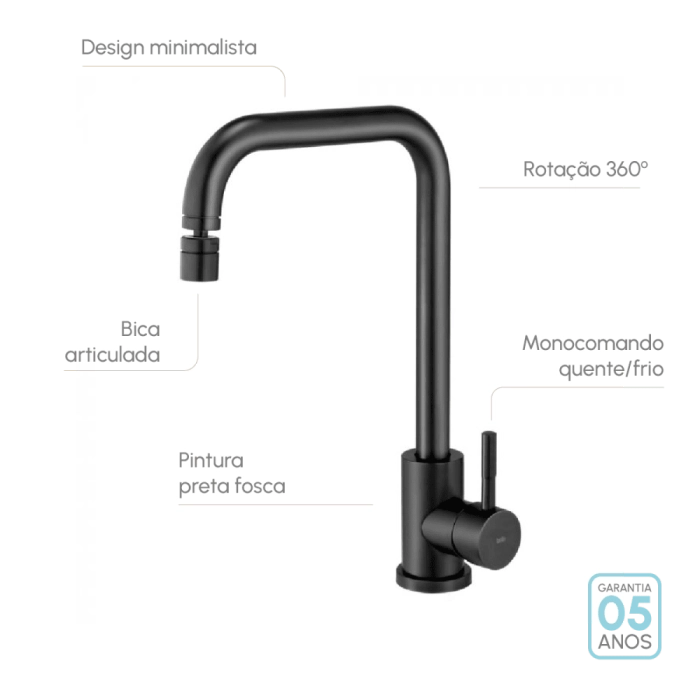 Torneira Monocomando Giratória de Cozinha Inox (Malta Preta Fosca)